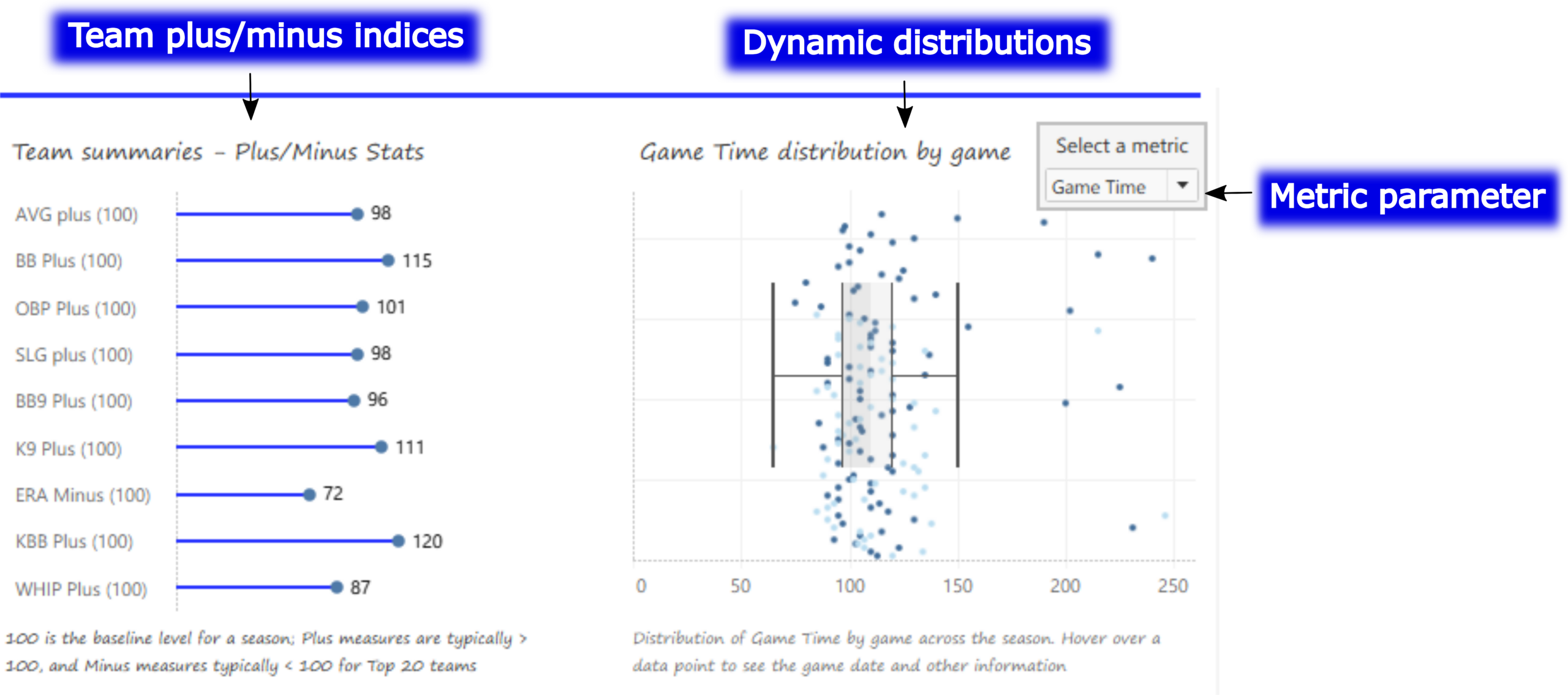 - By using the dropdown list to update the data in the distribution chart; runs, hits, doubles, and more can be shown at game levels