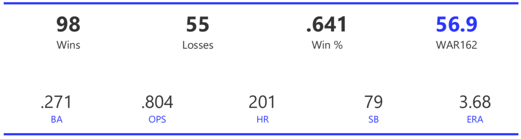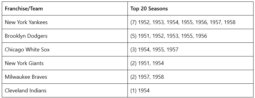 Welcome to the second countdown post in our series of MLB team rankings for the 1940s. As a reminder, the teams are ranked from #20 through #1 based on aggregate WAR162. For the 1940s (1940-1949), a total of 160 teams were eligible (16 teams x 10 seasons), so the top 20 teams are a fairly exclusive group. We’ll summarize each team, including portions of their team dashboard, and explain how they attained their ranking. So, without further ado, here are the teams ranked #15 through #11.