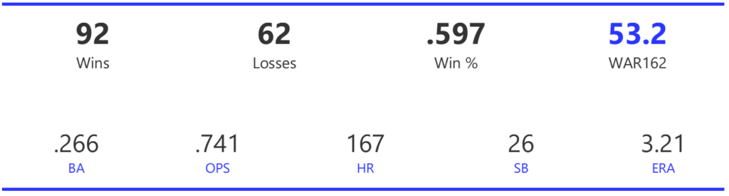 The Cardinals came very close due to their pitching. The offense was good, not great, totaling 766 runs, far behind the Dodgers’ 879. They did lead the league in doubles, and were second in triples, but far back in home runs and last in stolen bases. The Cards led the league in BA, and placed second to the Dodgers in OBP and OPS. On the pitching side, the Cards staff easily topped the NL in ERA and WHIP, and ranked near the top in other categories.