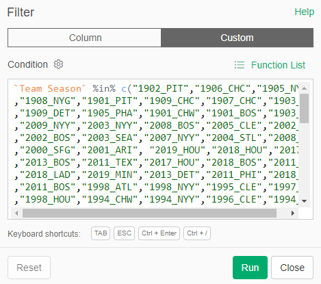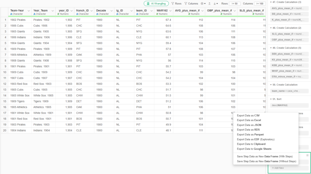 Assuming we’ve done everything correctly to this point, exporting the data to .csv files is the easiest part of the process. The key is to make sure we export the data from the appropriate step in Exploratory, where all the field updates, formulas, and filters have been applied. For our team-level WAR file, we apply a decade filter, seen in the bottom right: