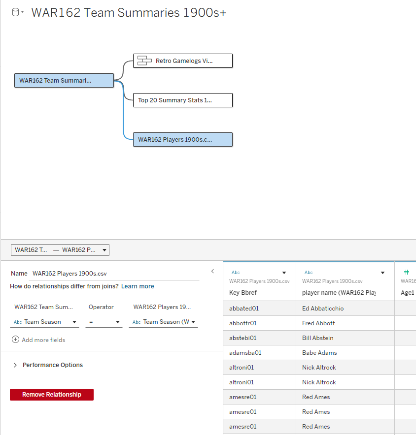 I elected to use the WAR162 Team Summary file as my base table, and then join the other tables to it. Essentially, that takes us from a small base table with highly summarized information that connects to tables with much greater detail. Before we move on, note that the two Retro Gamelogs files show as a single file, as they have been combined using Tableau’s union capability (since all fields are identical, we can simply combine them). Now we can take a look at the relationships connecting each table: