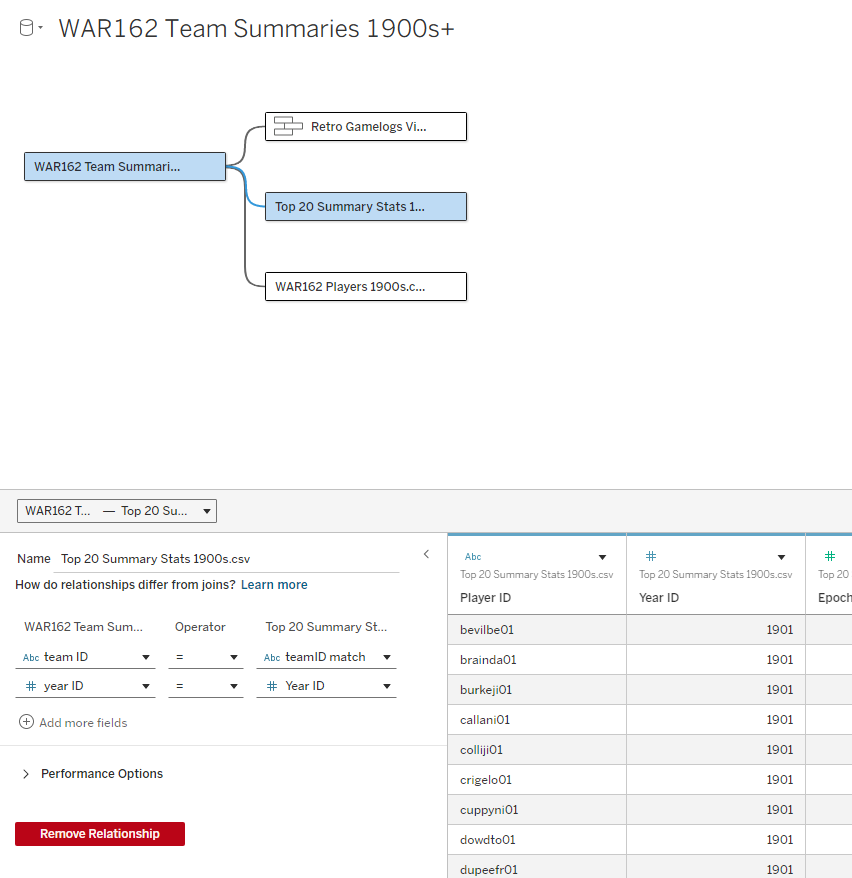 Our first relationship connects the base table with gamelogs data, and is based on teamID and yearID (season). Simply put, we can see every game-level record for each of the 20 teams in our 1900s decade, just by joining those two fields.