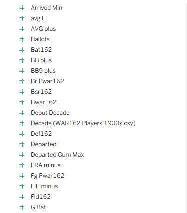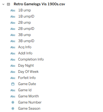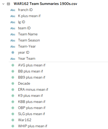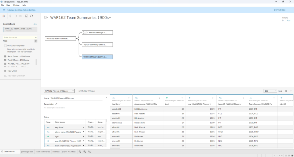 My third source proved a bit challenging – I created flags to identify each top 20 team, which seemed like an easy solution. Unfortunately, my solution fell apart when two Top 20 teams played one another (say the 1901 Red Sox vs. the 1901 White Sox). This caused some wonky outcomes at the game level, where one team would lose some game results based on how my code was written. Long story short (after some hair-pulling), I managed to separate the data into two files – one for home games and another for visitor games. Now, I can merge the two data files in Tableau. Problem solved!