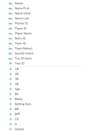 Here we are determining whether the Top 20 team was hosting a game (home game), and then using the home_score value. Otherwise, if it isn’t a home game, we use the vis_score value to count the runs scored by our top 20 team. We use this type of calculation for many different measures (doubles, triples, walks, etc.), with similar calculations for the opposing team values. The goal is to provide detailed game-level data for use in Tableau.