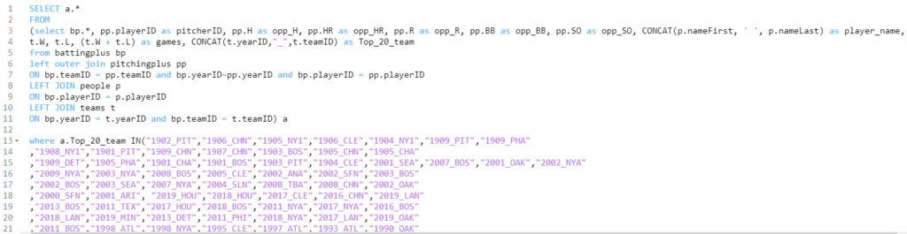 Next up is our join to the Top 20 Summary Stats table, which contains player-level stats for every season among our Top 20 teams. This includes most of the basic statistics fans are familiar with – runs, hits, doubles, home runs, and so on. Joining on teamID and yearID (season) provides access to all of these numbers.