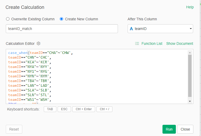 Notice the similar logic we just saw with the WAR data – I have created a Top_20_team field that can be used to easily merge the two data sets once we get to Tableau. This data is now in Exploratory, but we soon hit a little speed bump; team codes are not always the same across the two sources. I discovered this when I was falling short of 20 teams per decade, and used Exploratory to make some updates: