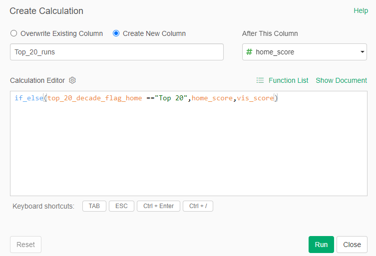 Aside from that issue, I used Exploratory to run a lot of calculations, some of which are likely to appear in the final dashboard. For example, calculating runs scored in a game: