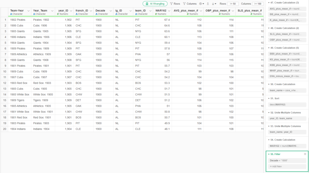 All the teams we want to analyze (20 per decade) are now included in our results; the others have been left behind (but not lost) in our data flow. The beauty of this approach lies in its ability to capture all decades; before sending to Tableau we can simply add one more filter that limits the data to a single decade (the 1920s, for example).