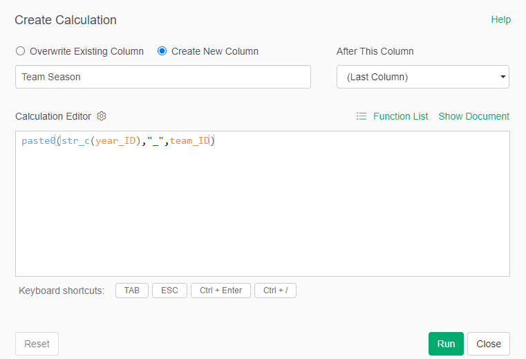 Let’s view some examples, beginning with the JEFFBAGWELL (WAR162) source. I previously created a number of steps and calculations last year as I was writing the book. We’ll pick up the data from that point and create some new steps. Let’s first combine the season and team codes into a new field (this will make it easy to filter the various sources:
